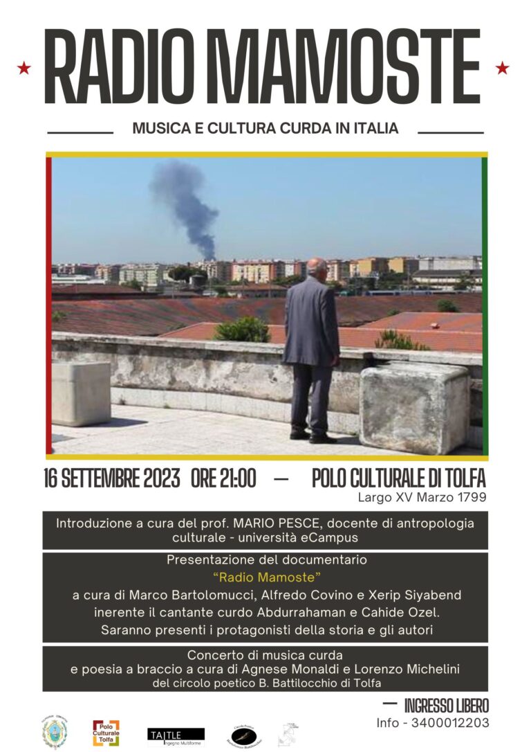 Presentazione del documentario “𝘙𝘢𝘥𝘪𝘰 𝘔𝘢𝘮𝘰𝘴𝘵𝘦” a cura di Marco Bartolomucci, Alfredo Covino e Xerip Siyabend, inerente il cantante curdo Abdurrahaman e Cahide Ozel.